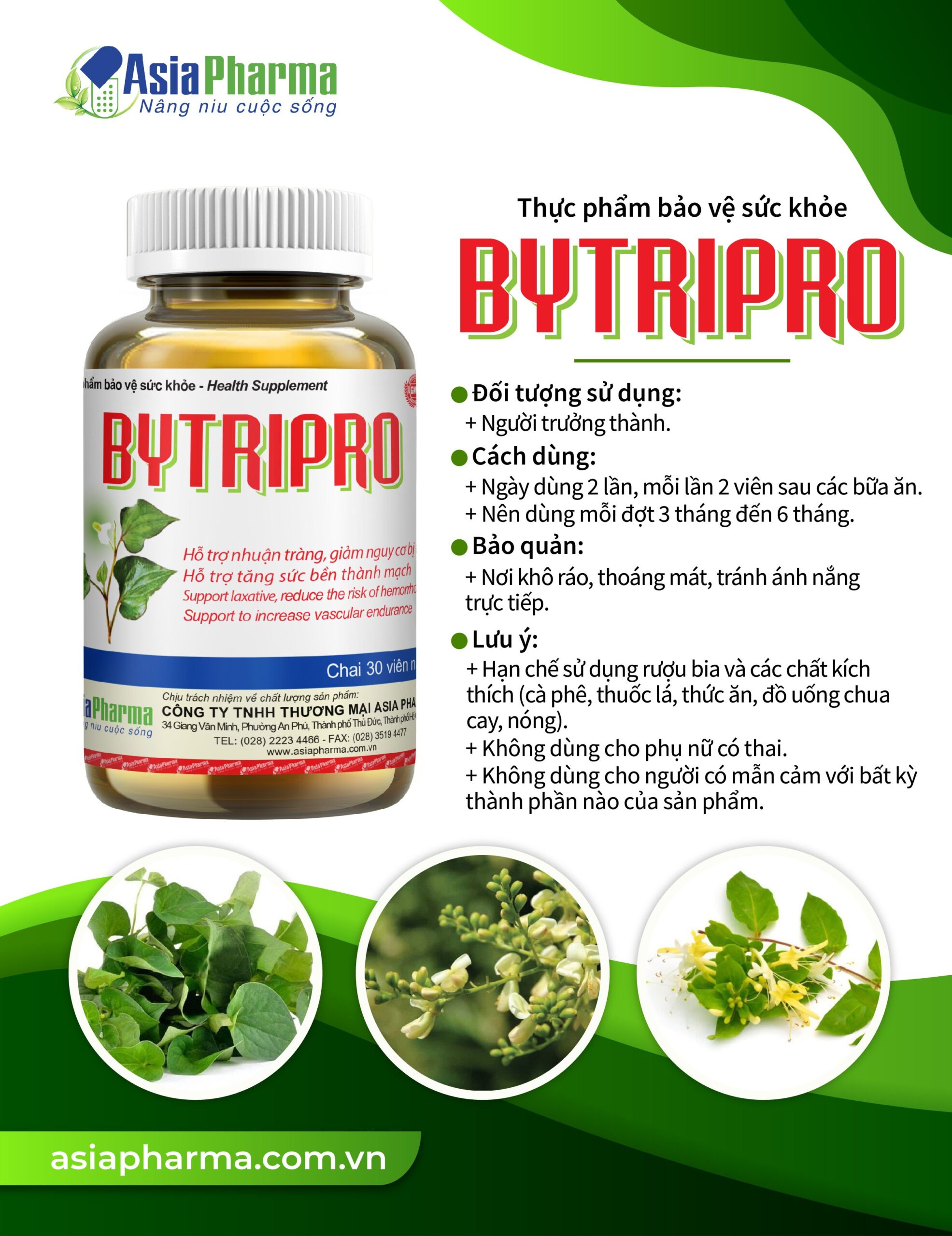 BYTRIPRO là sự kết hợp của hơn 10 loại thảo dược từ thiên nhiên như: Diếp cá, Hoa hòe, Sinh địa, Đương quy, Hoàng liên, Thăng ma, Hoàng cầm, Trắc bạch diệp, Chỉ xác, Kim ngân hoa, Bồ công anh, Cam thảo, Mè đen,… cùng một số thành phần khác.Có tác dụng hỗ trợ: