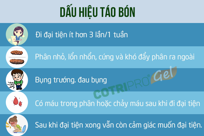 Người bị táo bón sẽ đi ngoài phân nhỏ, cứng và rời rạc. Nhiều trường hợp bị đau rát hậu môn và chảy máu theo phân khi đi đại tiện vì phân khô và lớn. Làm trầy xước niêm mạc trực tràng, hậu môn. Trường hợp này không thể đại tiện được, bụng sẽ có những cơn co thắt, bụng nặng, thắt lưng khó chịu. Luôn có cảm giác phân vẫn ở trong trực tràng nhưng lại không đẩy ra ngoài được.