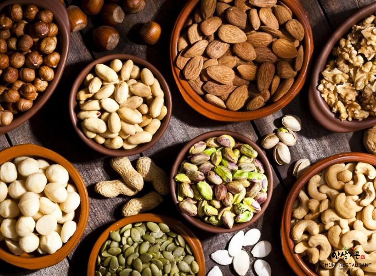 Bao gồm các loại hạt như óc chó, hạt điều, hạt hướng dương, hạt bí, đậu phộng,… Đây là những loại hạt dùng để ăn vặt khá hữu ích cho phái mạnh. Những loại hạt này ngoài chứa kẽm dồi dào còn có thành phần Arginine – là một acid amin cần thiết cho việc sản xuất Nitric Oxide, giúp quá trình lưu thông máu tốt hơn, góp phần cải thiện tình trạng rối loạn cương dương ở nam giới.